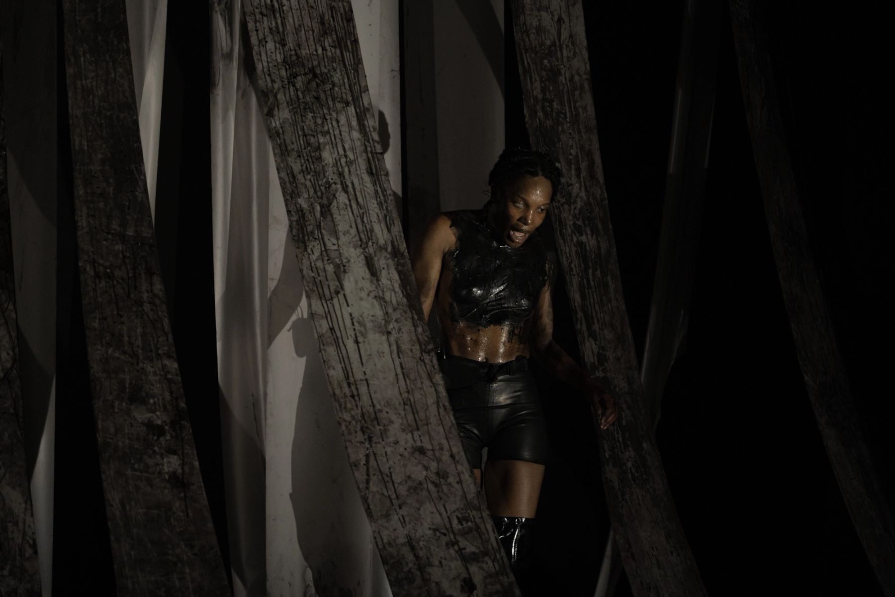 Plutselig er det hvitt strobelys, og Menzo har et Joker-glis om munnen. Hun står tettere på publikum og rapper om at fremtiden kun kan “be for ghosts”. Om det er døde personer hun snakker om, forstår jeg dem mer sommartyrer enn som spøkelser. Det rennende blodet ogde grå kontaktlinsene de har i øynenefår dem til å virke forslått. Djeveldyrkelse, blodbad…eller gjørmespa? Relasjonen mellom utøverne er under stadig forhandling. I én sekvens ser det ut som de skal gå inn for et kyss, men i siste liten spytter Menzo mer maling i motsatt retning av Cortes. Menzo forsvinner en liten stund og kommer tilbake i lårhøye støvletter. Sammen presser de kroppene sine mot hverandre og danner en slags edderkoppformasjon. Menzo plasserer føttene sine på hodet til Cortes som et tegn på hennes dominans. Det gjør hælene hennes til hans gevir ogham til en slags bafomet med horn på hodet. Avslutningsvis drar Menzo det strimlede lerretet fra raden de henger på ut til et stort spindelvev. Musikken og teksten de synger (som forøvrig kan leses her på Dansens Hus sine nettsider) er sjokkerende såvel som suggererende. Deler av opptaket er satt sammen av stemmer fra byer de viser forestillingen i det som blir kalt et “fragmentert rapkor”. Opptaket kommer i bakgrunnen for Menzo og Cortes’ tilstedeværelse og levende stemmebruk. De kler etter hvert av seg de stramme, lårhøye støvlene i sort lakk, ogblåser alvoret vekk med å le og bade i den sorte malingen før deforsvinner lattermildt inn i spindelvevet. Det gir verket en letthet som belyser håpet i mørket de roter seg bort i. Mørket er ikke uttrykk for desperasjon eller dystopi, men snarere at de lar seg trekkes mot universet og galakser der de strekker seg mot en posthumanistisk fremtid, uten døden som begrensning.