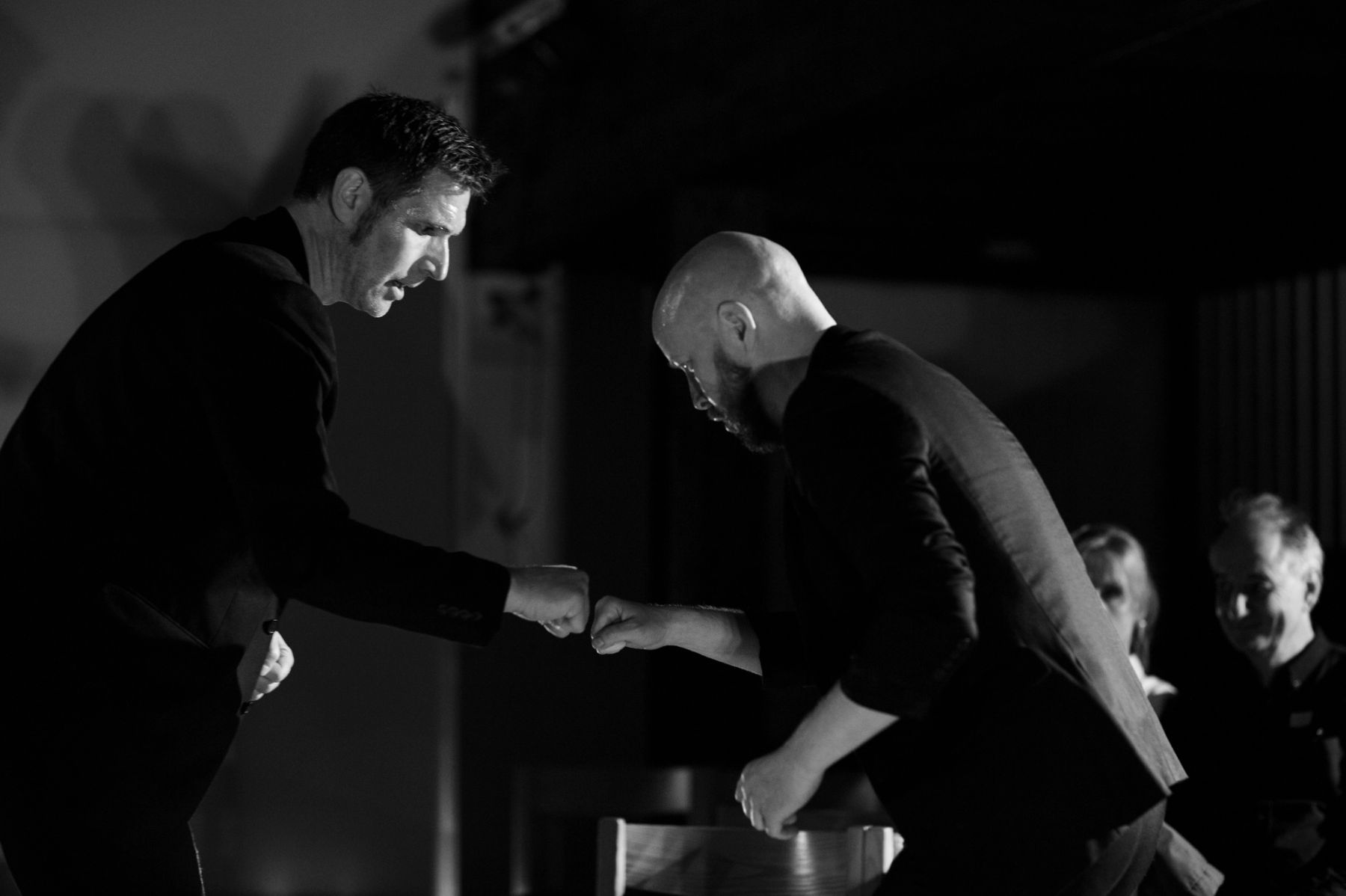 Fra maskulin voldsomhet til varsomhet Foruten nærværet og tilstedeværelsen som preger utøvernes tilnærming til materialet og rommet, er en av de fremste kvalitetene etter min mening hvordan forestillingen synliggjør forskjellige aspekter ved det maskuline. Sekvensene er ladet med eksplosiv kraft når Heide og Helgesen jager hverandre. De leker katt og mus mellom stolradene, løfter hverandre opp, slåss i knokekamp og når de kaster hverandre rundt i bryting slik at de nesten faller overende er det kroneksempelet på det mannlige – en velkjent idé om den sterke mannen som krever sin respekt fra andre. Kontrasten til de varsomme sekvensene med rolig vals der utøverne holder rundt hverandre, danser tett i tett eller lener kroppene inntil hverandre blir desto sterkere som følge av voldsomheten i de andre delene.